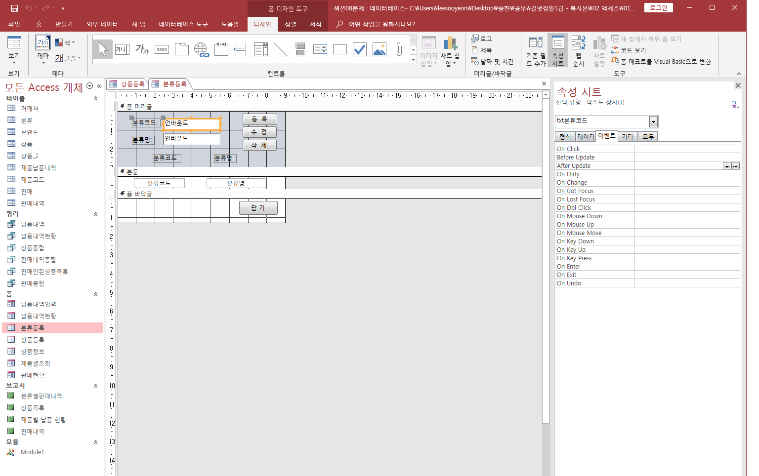 기출따라하기에서 4번 문제의 4번쨰 분류등록 폼의 'on load' 이벤트에 해당 프로시저를 작성하라고 하는데 on load가 없습니다.