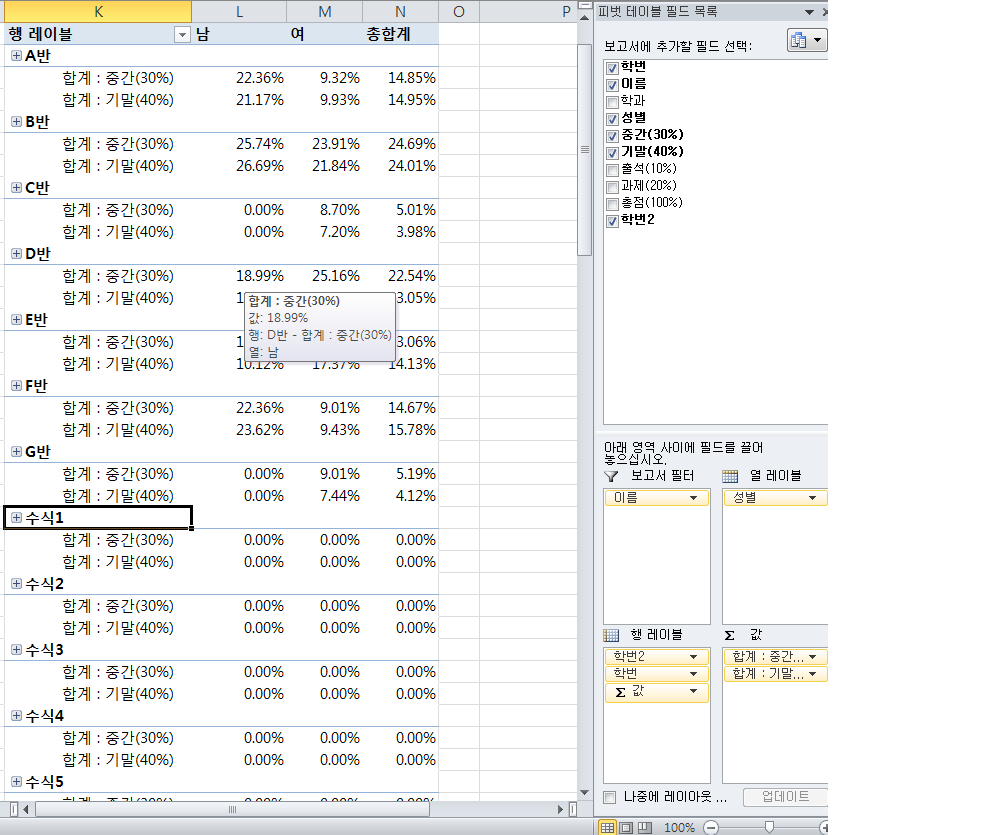그룹의 이름을 수식입력줄에 a반 , b반 등등 입력하고 나니