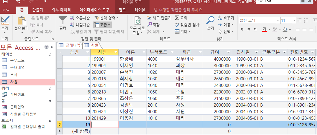 순번 필드를 삽입하고 일련번호로 1씩 늘어나게 하여 123456789 10 까지 입력된 필드들은 되어있는데 캡처사진과 같이 233페이지에서 레코드 를 esc를 두번 눌러 입력 취소하라는것을 하다보니 새 레코드에 11이 아닌 19가 입력되는 지경까지 이르렀는데 이래도 정답처리가 되는 건가요? 의도한 바는 11이 나와야 하지않나요?