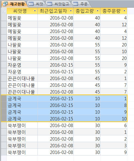 1. 재고현황의 <요약>을 해제하면 금계국의 입고량이 10개인 것이 4개가 있는 것을 알 수 있습니다. 이건 씨앗 테이블에는 금계국 10이 하나가 있지만 주문 테이블에 금계국에 대한 것이 총 4건이 있는 것입니다.
