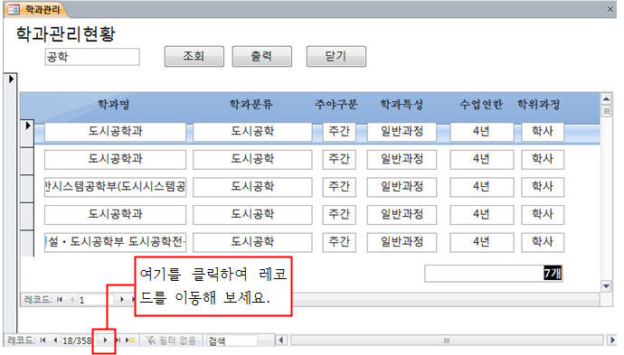 2. 저는 '공학'을 입력한 후 조회를 하면 건축공학, 토목공학 등이 모두 표시됩니다. 하위 폼에 있는 탐색 단추가 아닌 기본 폼에 있는 탐색단추를 클릭하여 레코드를 이동해 보세요.