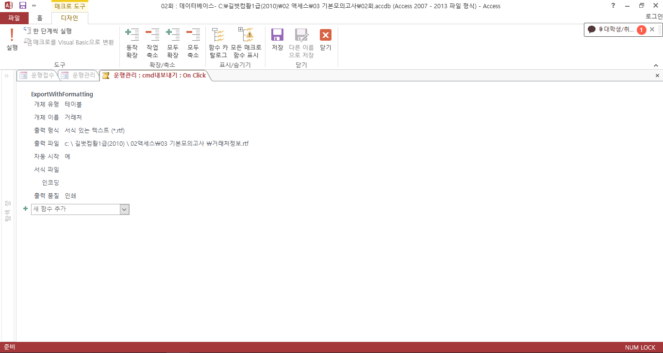 근데 또 정답파일을 열면 ACCESS개체 목록에 매크로가 나타나요