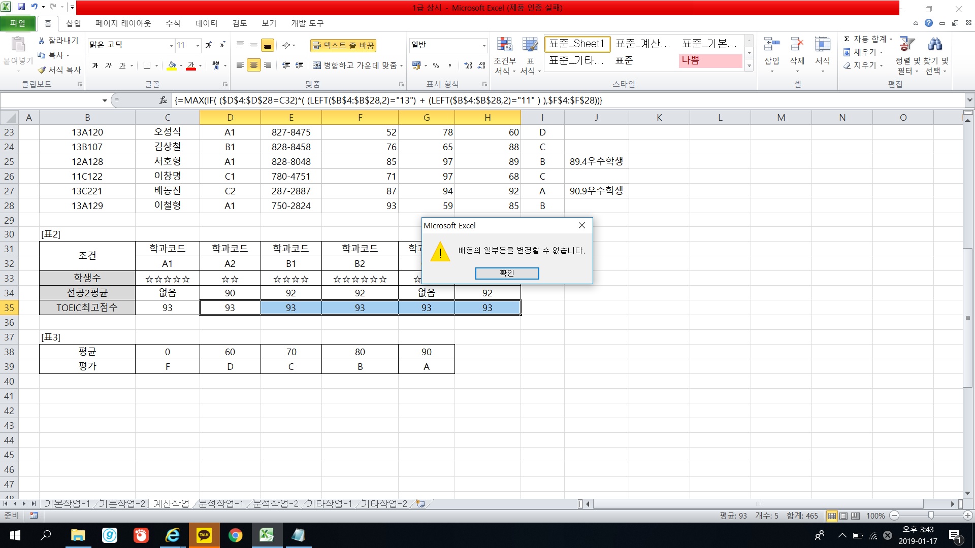 [C35] 셀 하나에 배열 수식으로 작업하신 후 채우기 핸들러로 수식을 복사해 주세요.