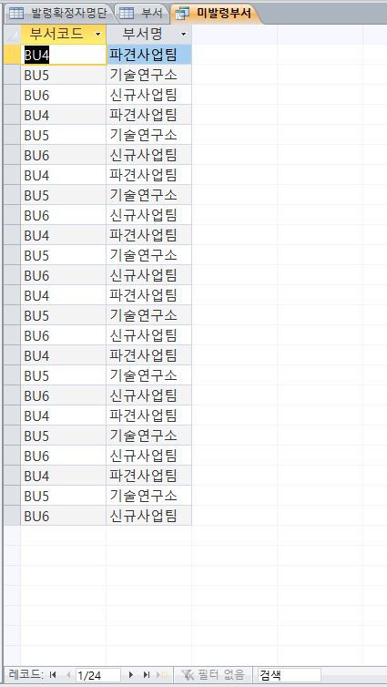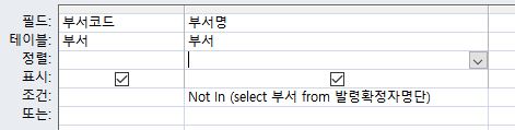 발령자확정자명단 테이블에 존재하지 않는 부서 테이블의 자료를 조회하는 쿼리를 만들 때 쿼리 마법사의 불일치 쿼리를 이용하지 않고 not in 함수를 이용했더니