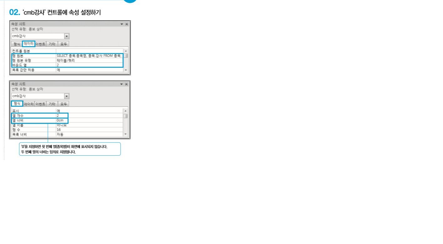 열 개수는 행 원본에 사용된 '종목명, 강사' 필드 2개를 의미하고 열 너비 0cm로 설정하면 cmb강사의 첫 번째 필드인 '종목명'이 화면에는 표시되지 않도록 하는 것입니다.