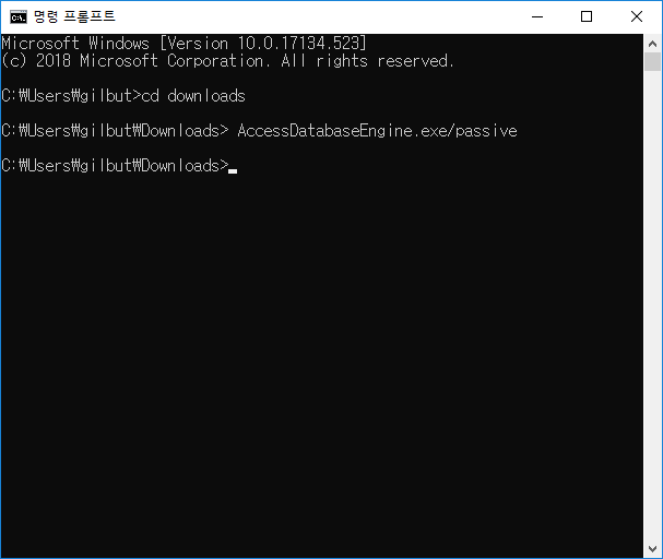 그 다음 줄에 AccessDatabaseEngine.exe/passive 를 입력 후 Enter키를 눌러주세요.