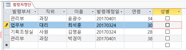 성별 필드는 두가지 값만을 가질수 있는 데이터 형식으로 설정하고,(예/아니오)