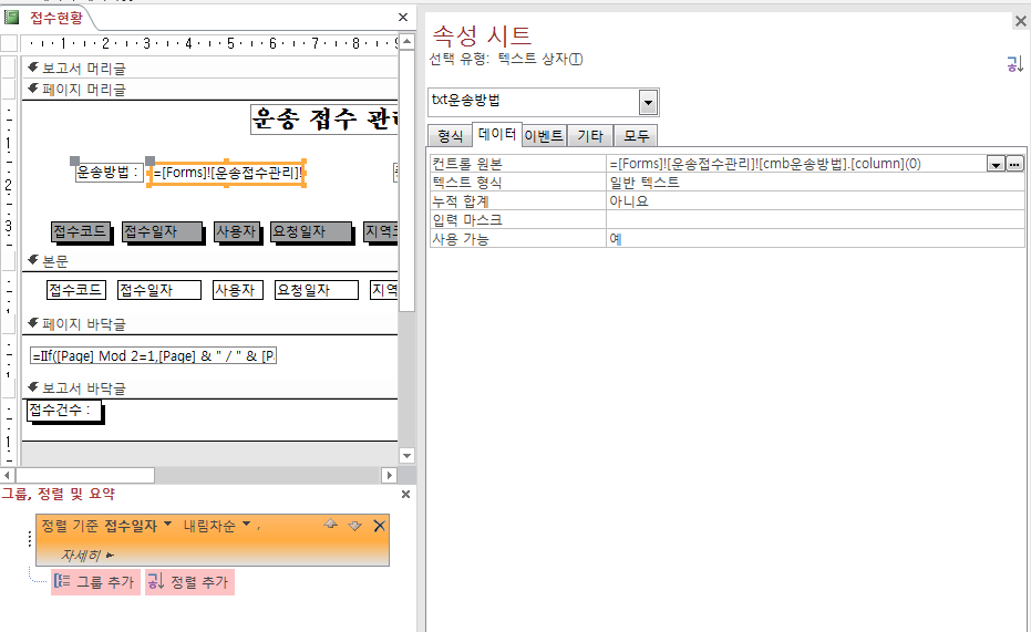 '운송접수관리' 폼에서 운송방법과 중량을 선택하신 후 [보고서 보기] 버튼을 누르면