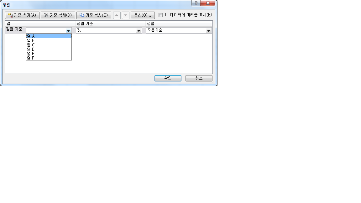 블록 지정 ㅎ 정렬을 클릭하는데 대화상자에서 정렬기준에 열A B C D 이렇게 표시되는데
