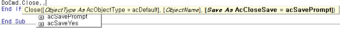 3.보통 Docmd.close 만 해봤는데 이번엔 저장여부를 묻지 말라는 문이 있어서 틀렸네요.. Docmd.Close 띄어쓰기 했을때 캡처 사진에 나오는 저것에 대해서 설명 부탁드립니다.