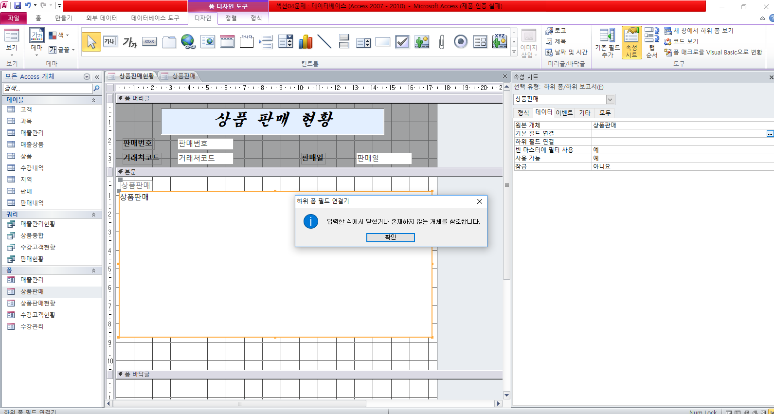 기본폼과 하위폼의 레코드 원본이 정확히 설정 되지 않은 경우 나타나는 메시지 입니다.