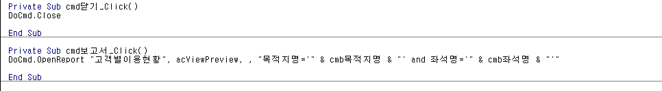 밑에 사진처럼 DoCmd.OpenReport "고객별이용현황", acViewPreview, , "목적지명='" & cmb목적지명 & "' and 좌석명='" & cmb좌석명 & "'" 이렇게 입력했는데요,