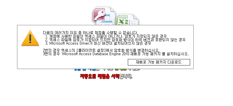 만약 64비트 드라이버 설치 후에 같은 문제가 발생한다면 32비트용 AccessDatabaseEngine.exe 를 다운받아
