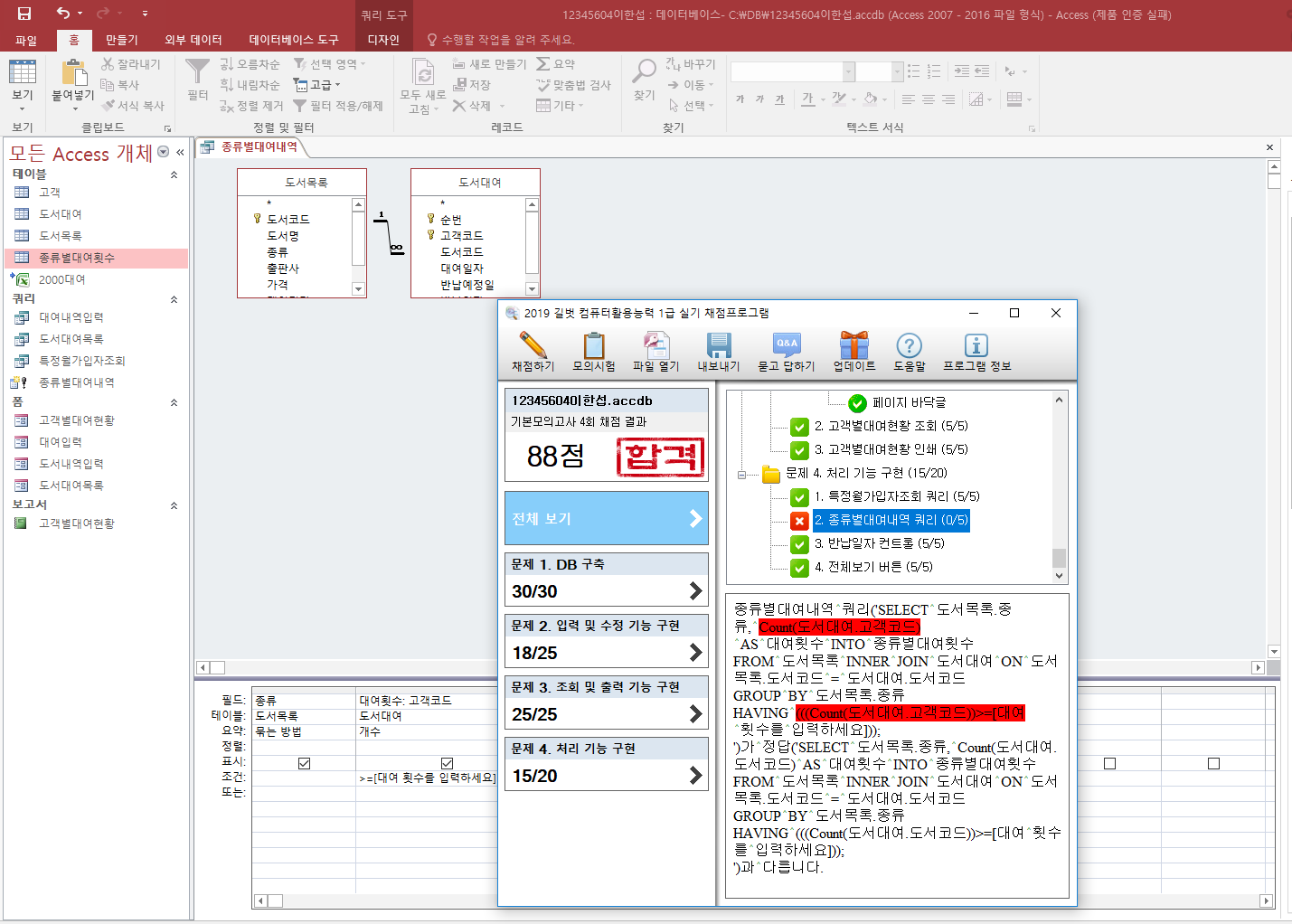 대여횟수는 해설에서는 '도서코드'로 구했고, 독자님은 '고객코드'로 구했기 때문에 채점프로그램에서 감점된 것입니다.