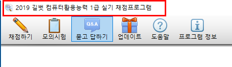 사용하시는 채점프로그램명이 아래 이미지와 같이 ' 2019 길벗 컴퓨터활용능력 1급 실기 채점프로그램' 인지 확인 부탁드립니다. 채점프로그램도 각 도서에 맞게 제작되어있기 때문에 자료와 채점프로그램이 다를 경우 해당 오류메시지가 나타날 수 있습니다.