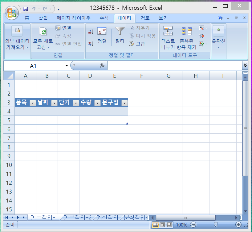 문제1-1 외부데이터가져오기 기능으로 조건에 맞춰 A3셀에 표시하는 문제입니다.