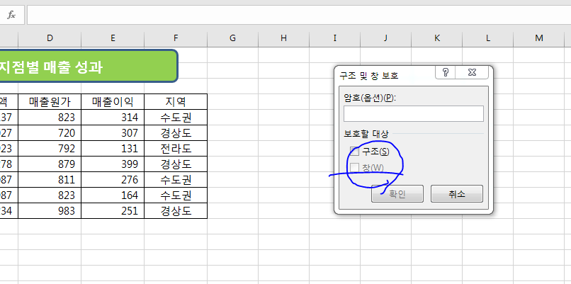 다음 사진과 같이 구조에만 체크 할 수 있고 창에는 체크 할 수 없게 되어있어요 ㅠㅠ