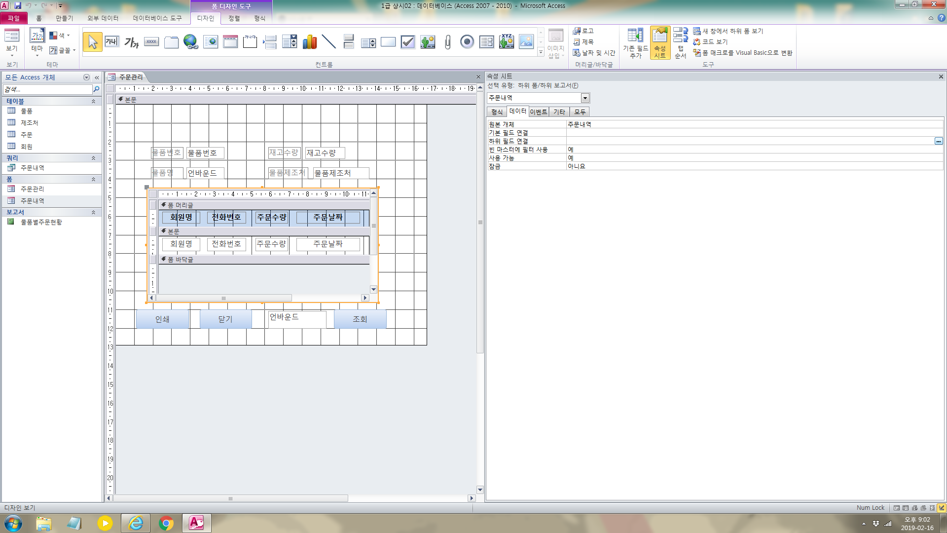 기본 폼의 레코드 원본인 <물품> 테이블의 '물품번호'와 하위 폼의 '주문내역' 쿼리에서 '물품번호'를 연결한 것이죠.