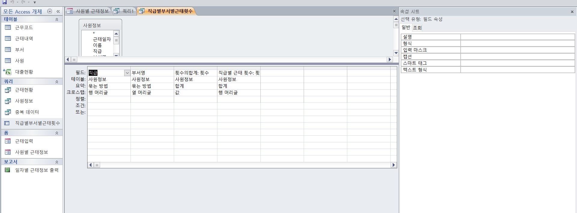 문제에는 단지 직급별 부서별 근태횟수 구하라는 말뿐인데요?