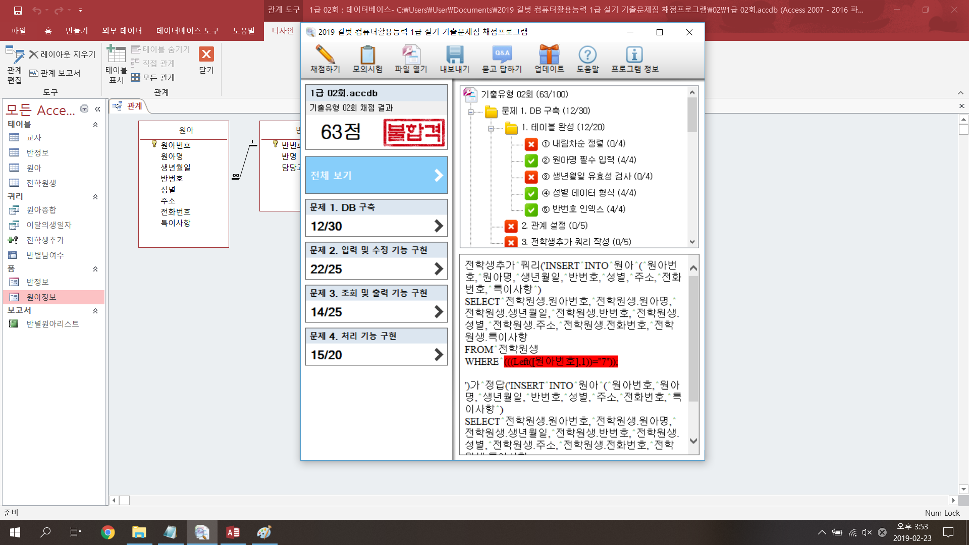 질문하신 경우도 실제 시험에서는 맞는 것으로 채점됩니다.3. Left([원아번호],1)="7" 로 사용하시면 됩니다.