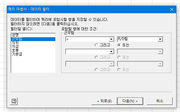 직급의 2를 '또는:'란으로 이동 시켜주시면 되는데, 간혹 'R/D팀'이 없어지는 것과 같이 보이기도 합니다.