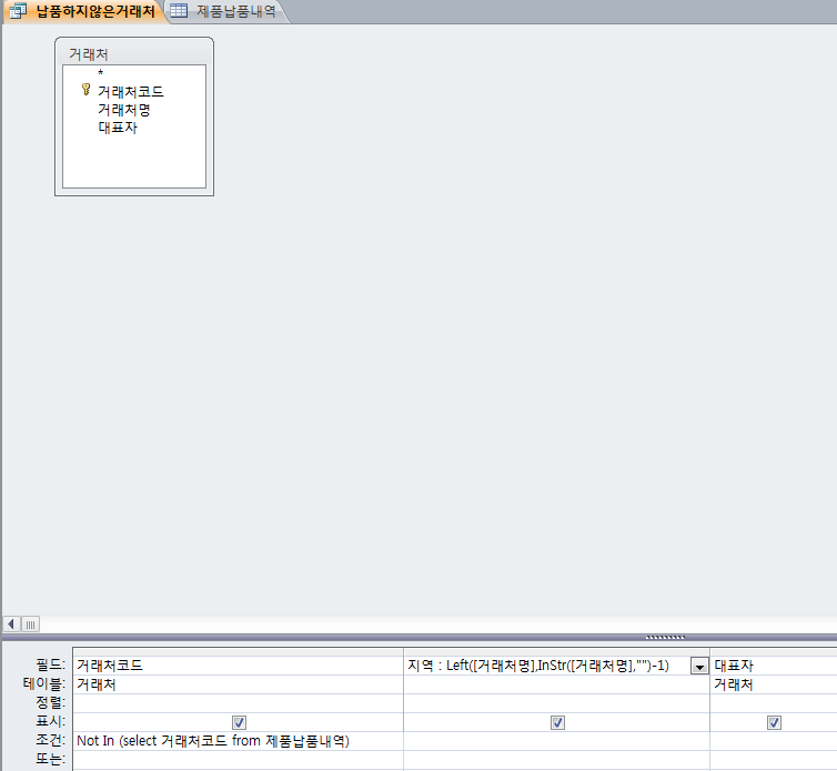 수정 후 : 지역: Left([거래처명],InStr([거래처명]," ")-1)
