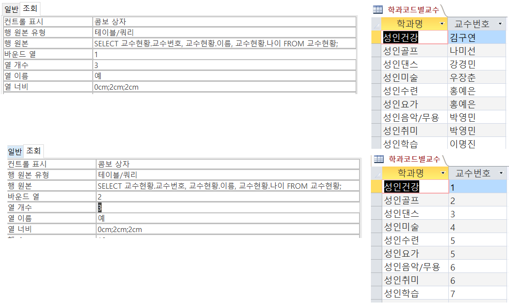 화면에 표시되는 열은 열 너비 0cm;2cm;2cm 이므로 교수번호는 표시되지 않고 이름과 나이만 표시됩니다.