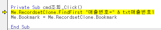 2. 엑세스 실전모의고사 c형 문제3-2에서 조회 버튼에 클릭 기능을 구현할 때, 맞게 작성한 것 같은데 자꾸 디버그 명령이 뜨는데 어디가 잘못된건가요? (파일 첨부 했습니다)