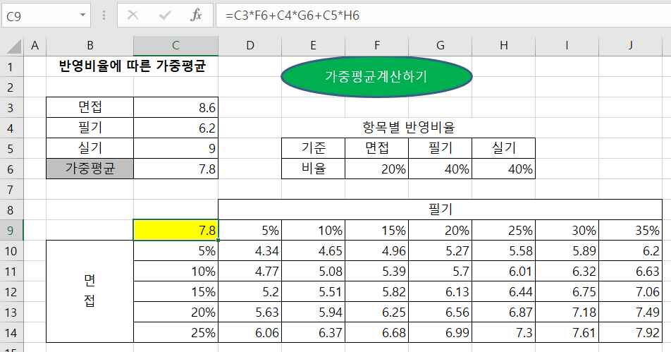 면접과 필기의 반영비율이 달라질 경우, 가중평균의 변화를 데이터 표로 구하는 것이죠.