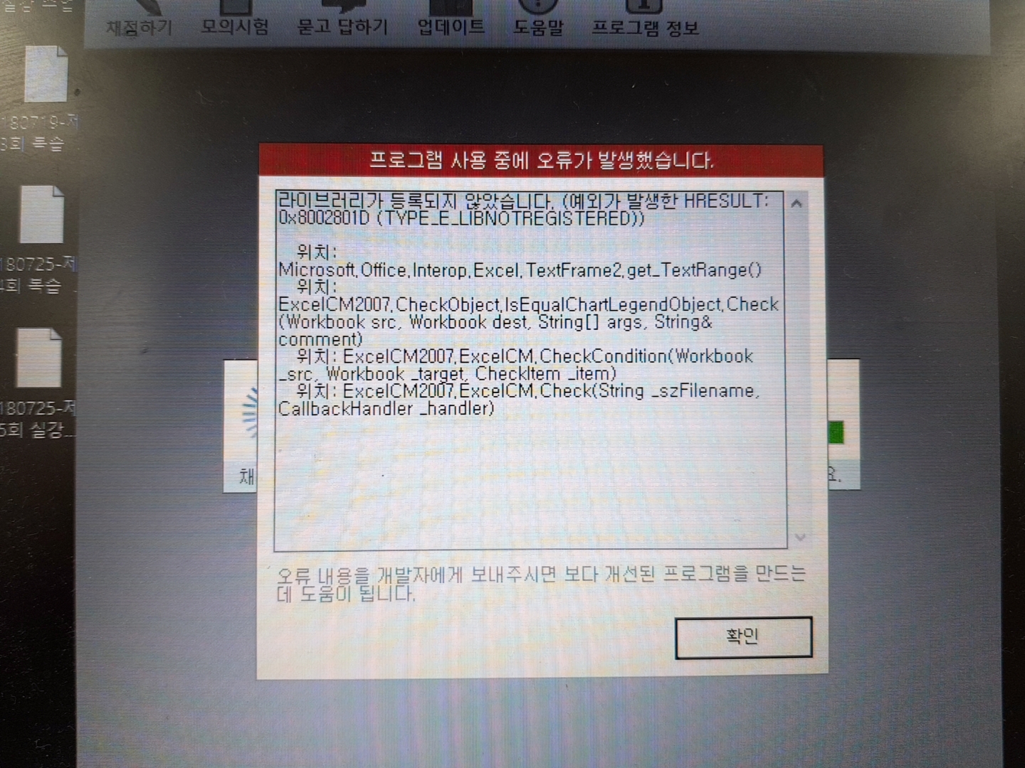 번거로우시겠지만 오피스 프로그램을 재설치하신 다음 채점프로그램을 설치해 사용해주시길 바랍니다.