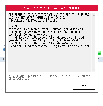 문의하신 오류는 엑셀프로그램의 vb 기능에 문제가 발생해 오류 메시지가 나타난 것으로 보입니다.