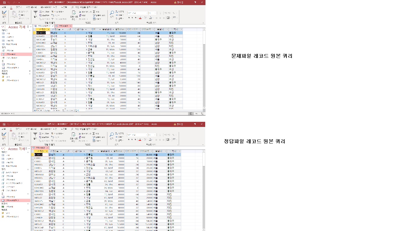 폼의 레코드원본인 '열차표종합' 쿼리가 답안파일과 문제파일이 다르게 정렬되어있더라구요