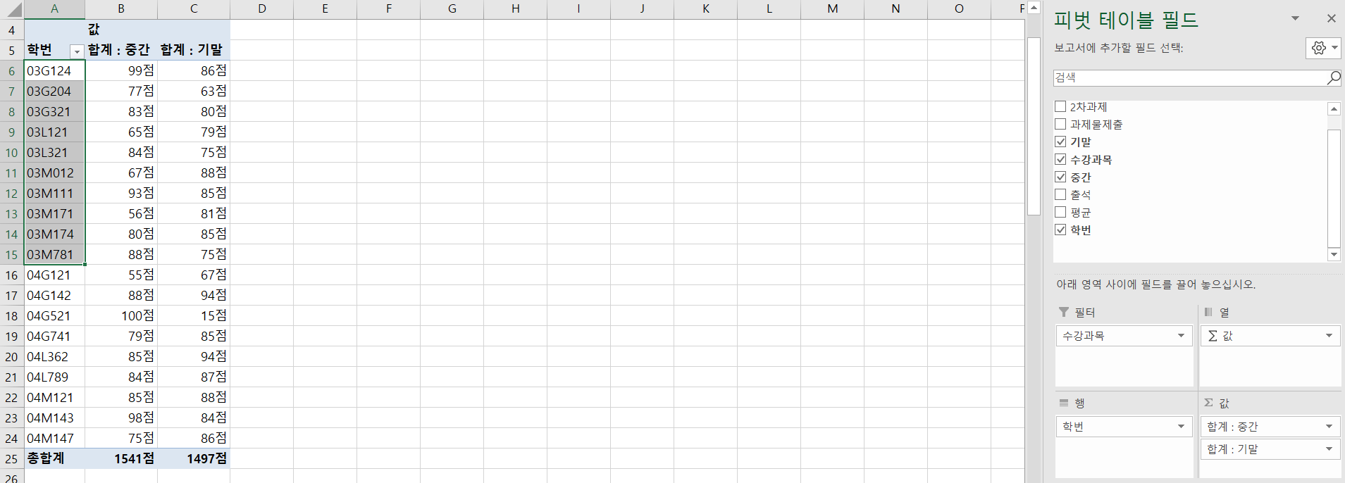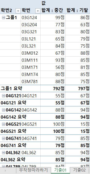 아래 사진과 같이 03학번 밑에 있던 04학번 부분이 개별적으로 그룹1 요약으로 바뀝니다.