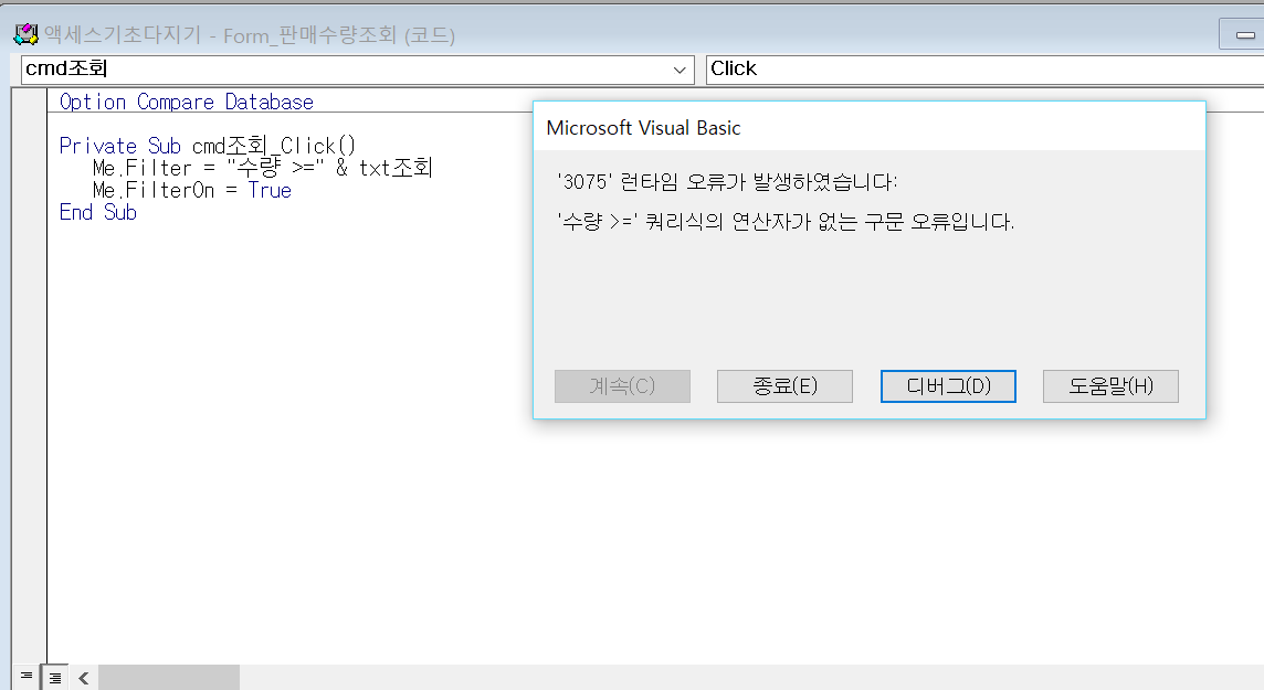 p37 에서 20번에 책에 있는대로 코드를 입력했는데 3075 런타임 오류가 뜹니다.