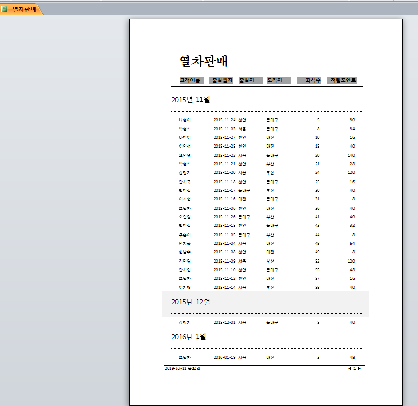 보고서의 정렬은 출발일자의 연도와 월에 대해 오름차순 정렬되었습니다.