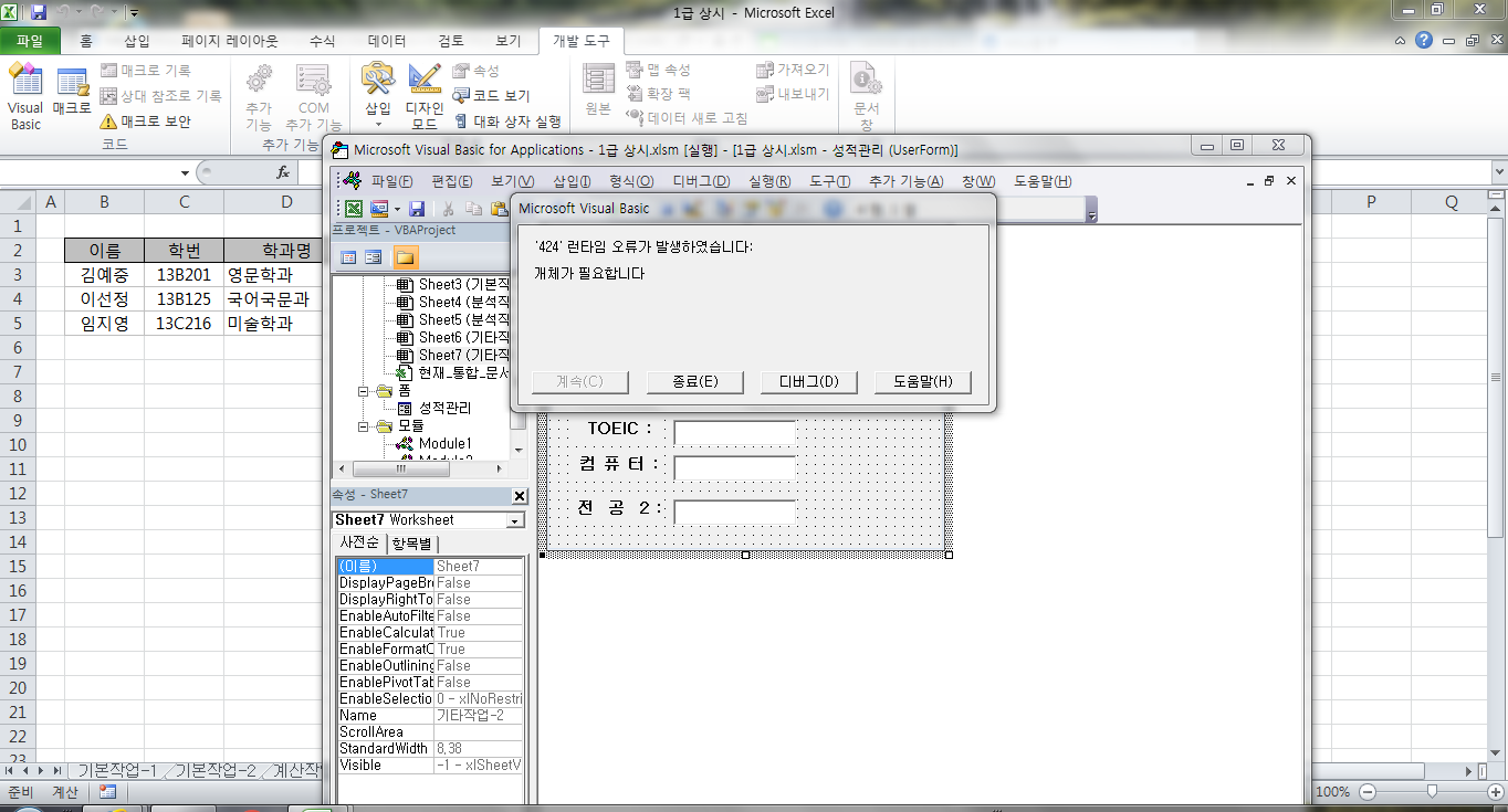 엑셀 프로시저 실행오류