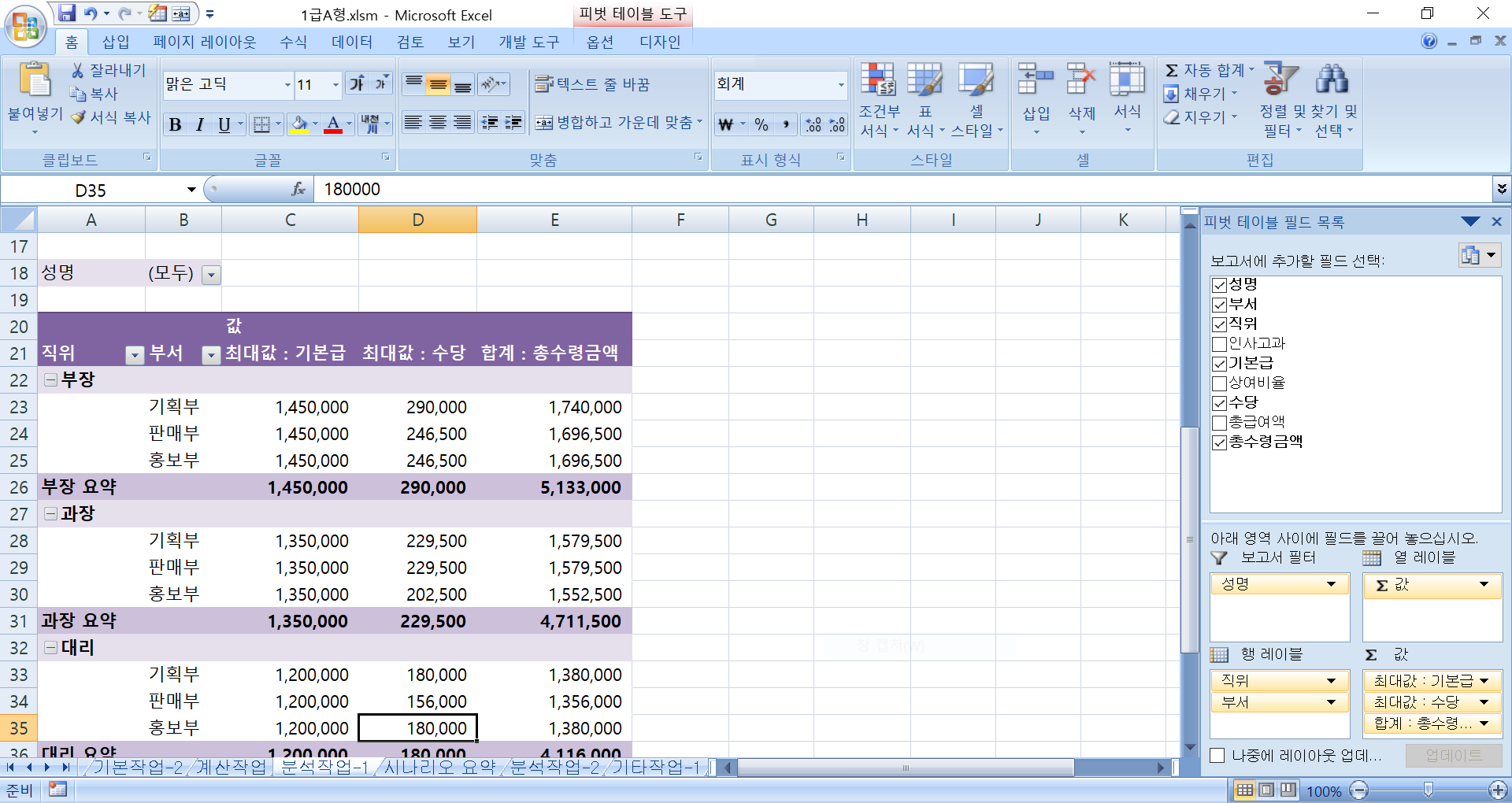그리고 위 사진에서 D35를 더블클릭하면 홍보부 대리의 수당의 최댓값에 대한 시트가 나오는거아닌가요??