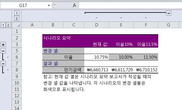 매번 시나리오 요약을 작성할때마다 부분합 작성시 나타나는 확대/축소 바(?)가 나타납니다.