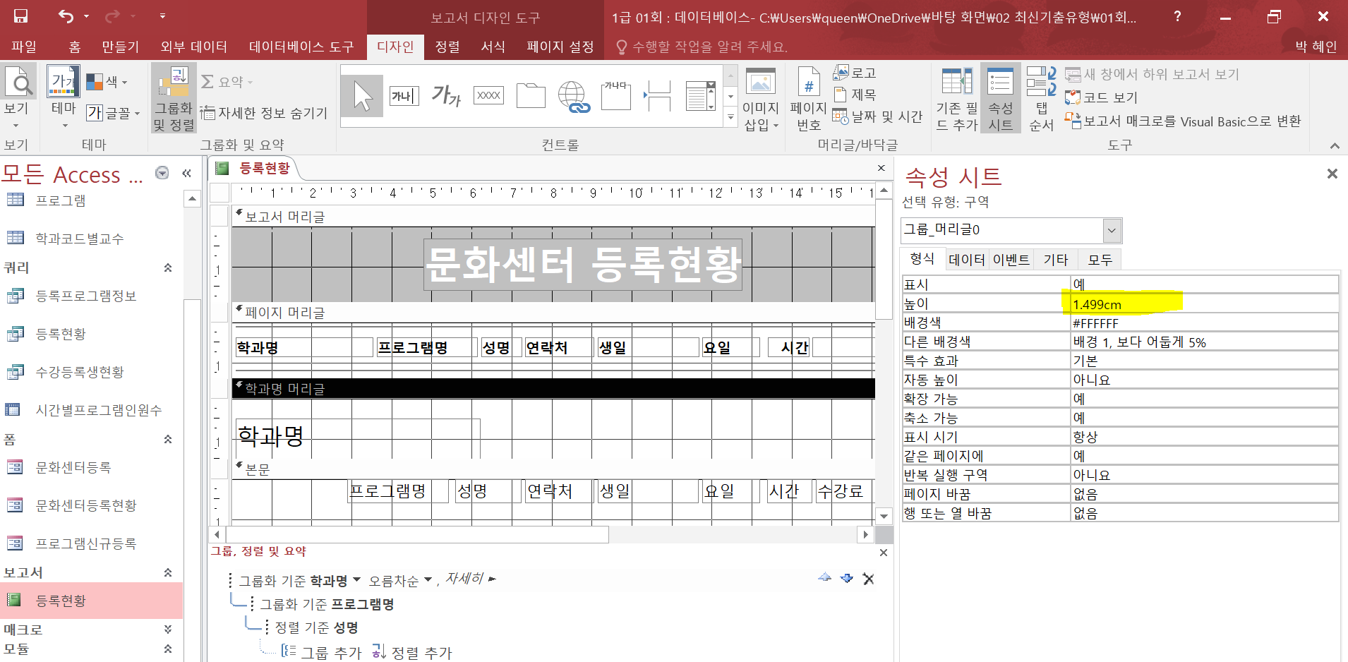 머리글 영역의 높이를 1cm로 조절하시오