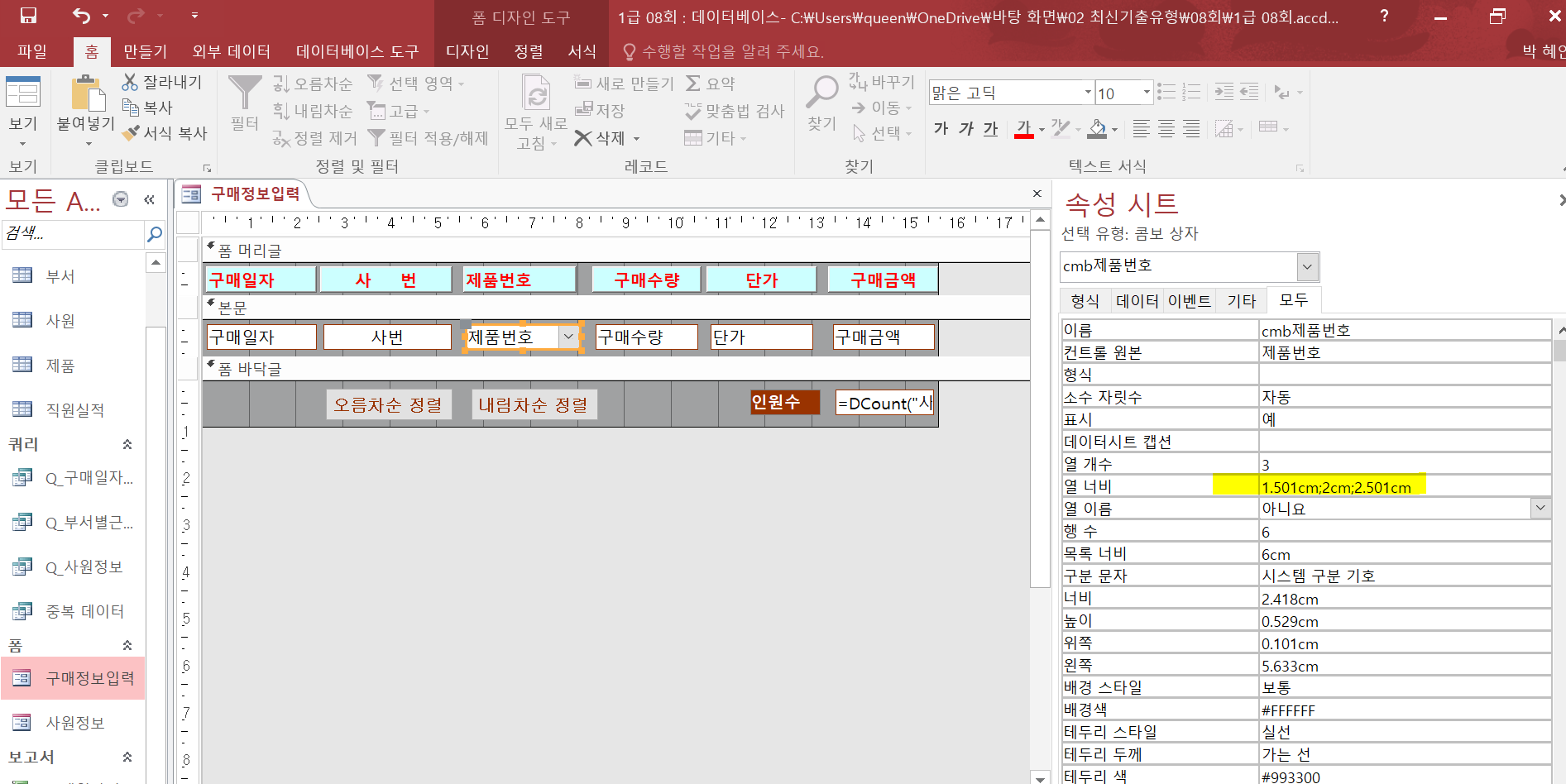 2.'구애정보입력' 폼의 제품번호 콤보상자에 대해 다음과 같이 조회속성을 설정하시오