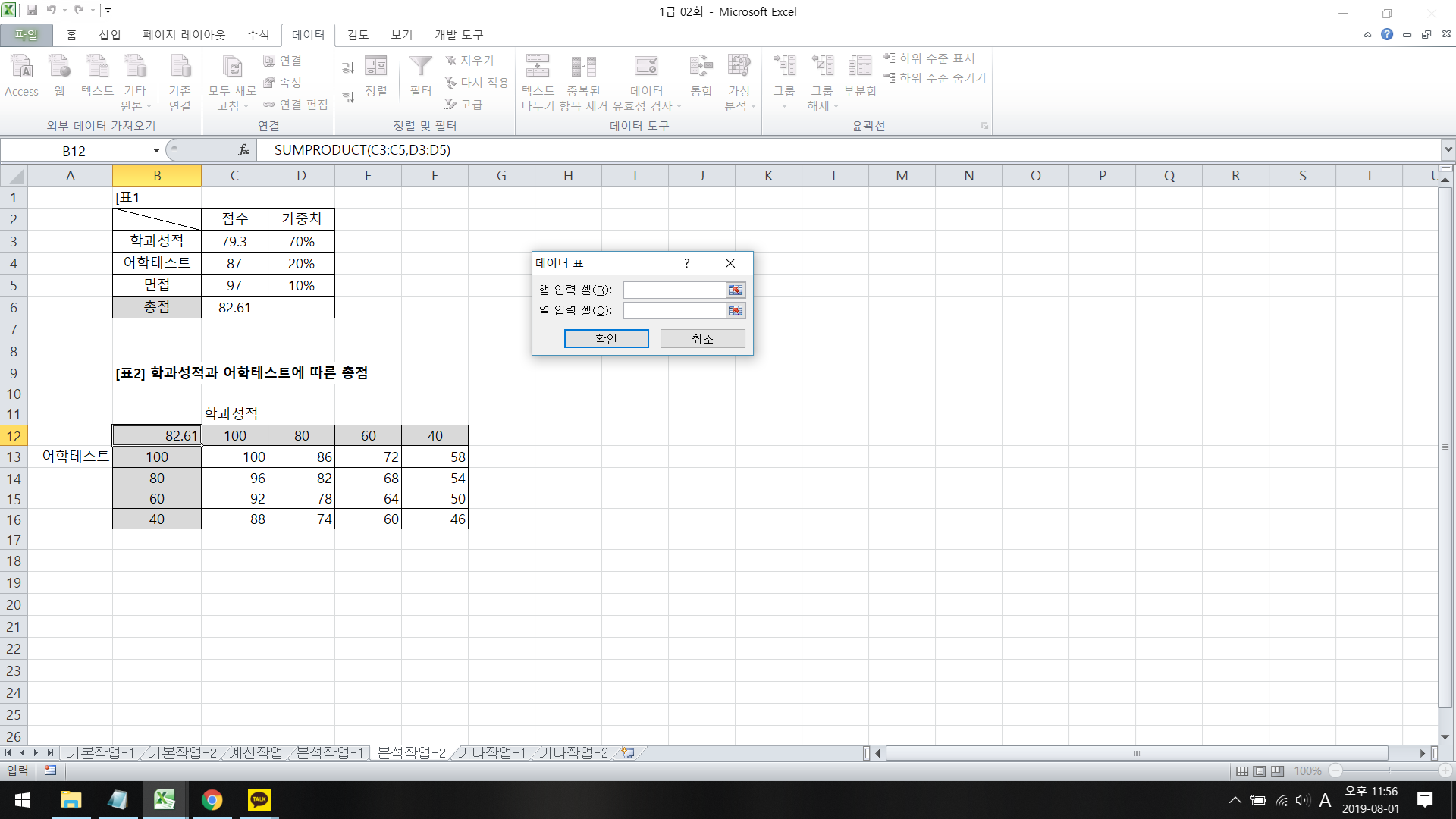 데이터 표를 통해 어학테스트와 학과성적의 변화에 따라 총점을 구할 수 있습니다.