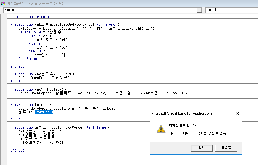 마지막 레코드의 분류코드 컨트롤에 포커스가 이동이 안되고
