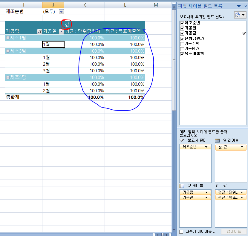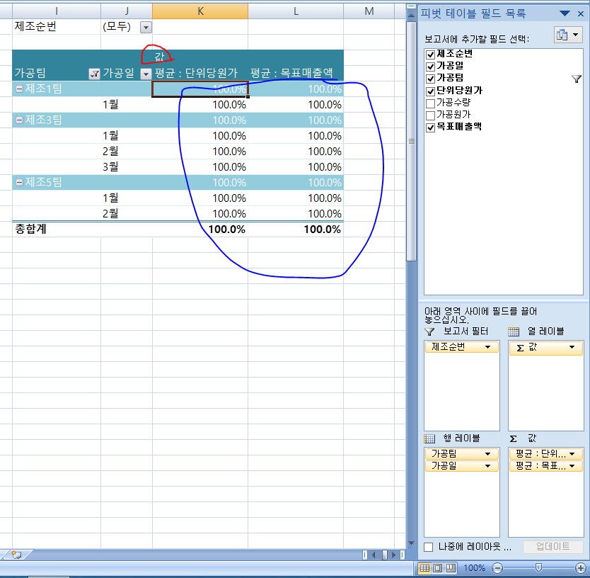값 필드 설정에서 합계를 평균으로 바꾸고, 소수 자릿수 1로 설정하면 데이터 항목들이 전부 100.0%로 바뀌어요(파란색 표시 부분)