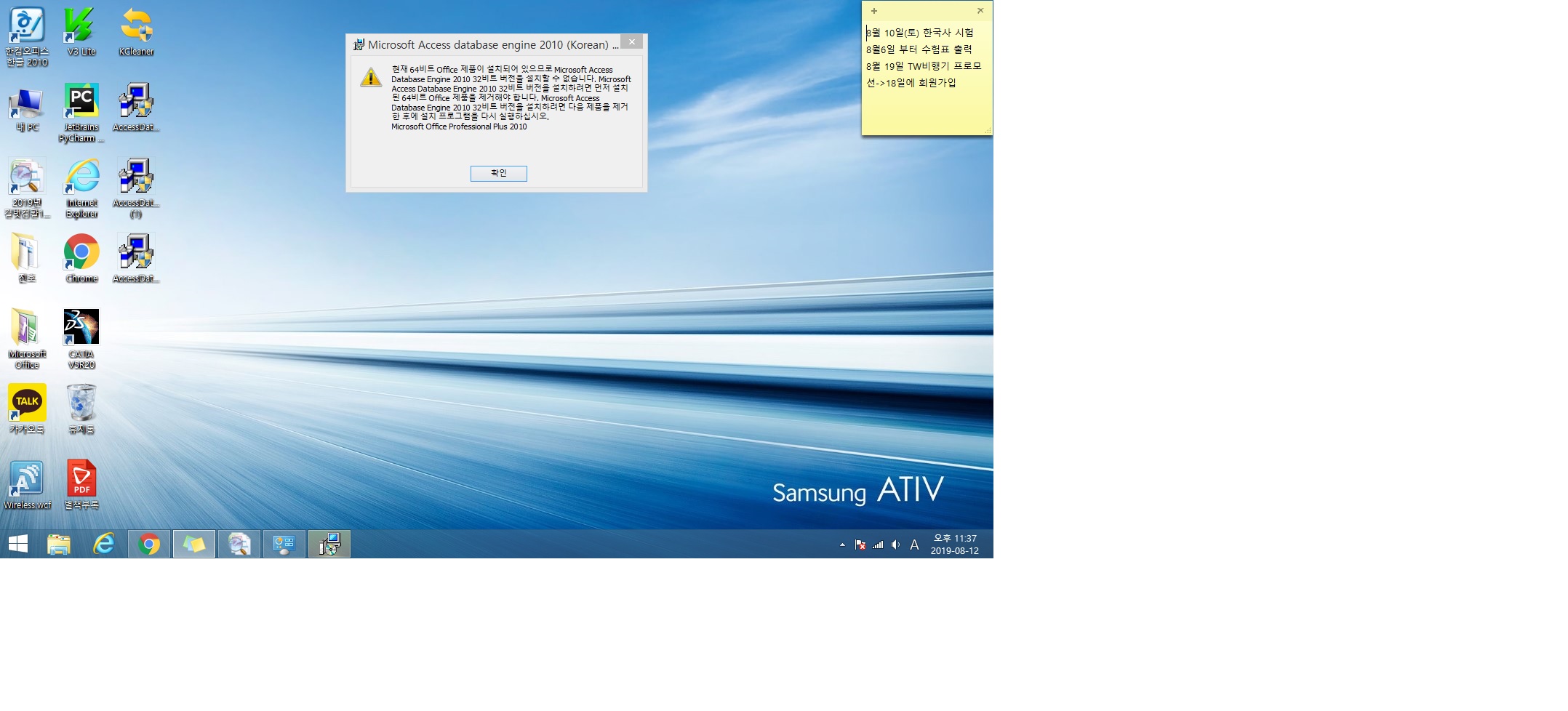 채점프로그램에서 엑세스를 채점할려고 하는데 '액세스 파일을 채점하기 위해서는 Microsoft.ACE.OLEDB.12.0드라이버가 필요합니다.' 라고 나와서 마이크로소프트 홈페이지 들어간 다음 64버전을 다운받았는데 계속 똑같은 오류가 떴습니다. 그래서 시나공IT에 나와있는 방법대로 64비트가 아닌 32비트를 깔려고 하는데 첨부파일과 같은 오류가 뜨는데 어떻게 해결해야하나요? 오류에서 해결책처럼 해결할려면 제 ms office를 지워야 하는건가요?
