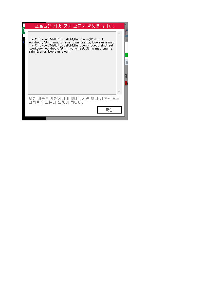 문의하신 오류는 윈도우 환경 문제로 비쥬얼 베이직 쪽에서 오류가 발생한 것으로 보여집니다.