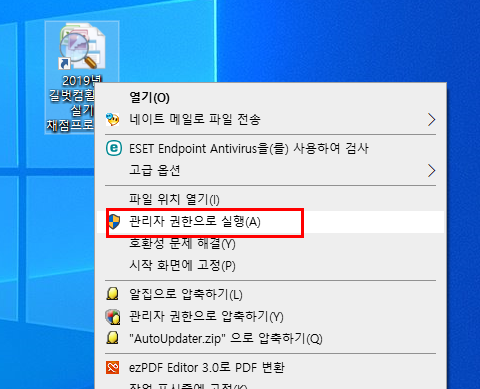 채점프로그램을 실행하실 때 프로그램 아이콘을 마우스 오른쪽 버튼으로 클릭해 나오는 메뉴에서
