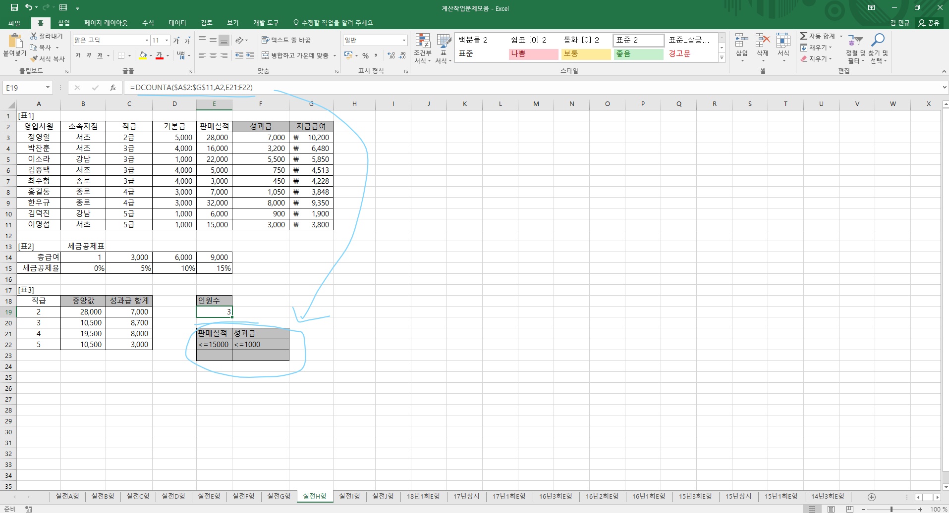 표시 한쪽에 dcounta 함수를 써서 푸는 문제 인데 범위쪽에 e21:f22 로 함수를 입력하면 3이 나오고 e21:f23 으로 입력하면 9가 나오는데 어떤차이로 이렇게 나오는지 잘모르겠습니다