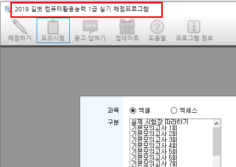 <2019 시나공 컴퓨터활용능력 1급 실기> 자료를 첨부해드리니 채점프로그램만 다시 설치해주시길 바랍니다.