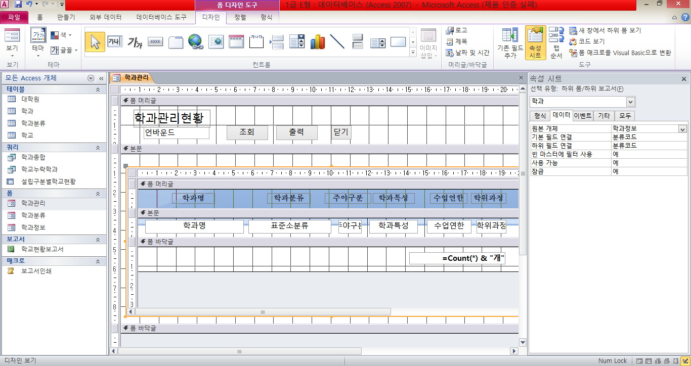 1. 하위 폼은 기존의 '학과정보' 폼을 가져오는 것으로,