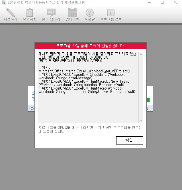 번거로우시겠지만 엑셀 프로그램을 재설치하신 다음 채점프로그램을 사용해봐주시길 바랍니다.